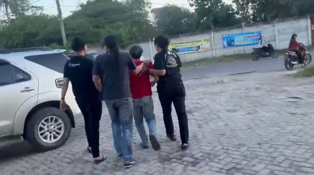 Yudhi Gepak yang memakai kaos hitam tampak diborgol dan dibawa ke mobil anggota Jatanras, sedangkan Padli yang memakai kaos warna merah digelandang ke salahsatu mobil warna hitam untuk menunjukkan barang bukti sejumlah uang yang dibungkus plastik warna hitam.