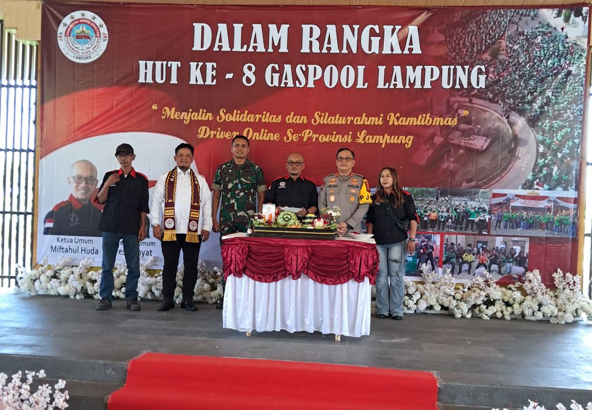 Gaspool Lampung juga membagikan 300 paket sembako kepada komunitas pengemudi online sebagai wujud kepedulian sosial. Acara ditutup dengan deklarasi kamtibmas oleh Gaspool Lampung: *“Gaspool Lampung siap bersama Polda Lampung menjaga keselamatan berlalu lintas dan situasi kamtibmas di Provinsi Lampung.”