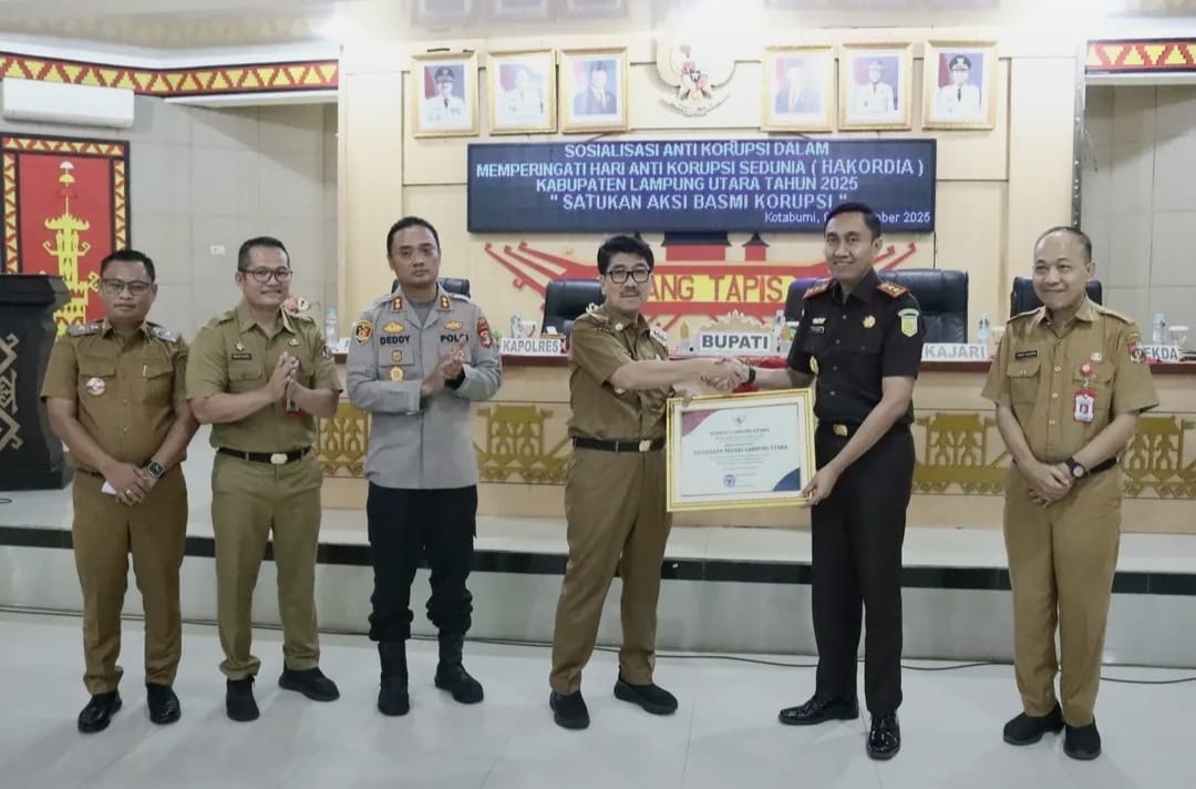 Sebaliknya, Kejaksaan Negeri Lampung Utara juga menyerahkan piagam penghargaan kepada Pemerintah Kabupaten Lampung Utara sebagai bentuk apresiasi atas komitmen daerah dalam memperkuat integritas birokrasi dan mendukung upaya pencegahan korupsi. Pertukaran penghargaan ini menjadi simbol penguatan sinergi antar lembaga dalam mewujudkan tata kelola pemerintahan yang bersih dan berkeadilan.