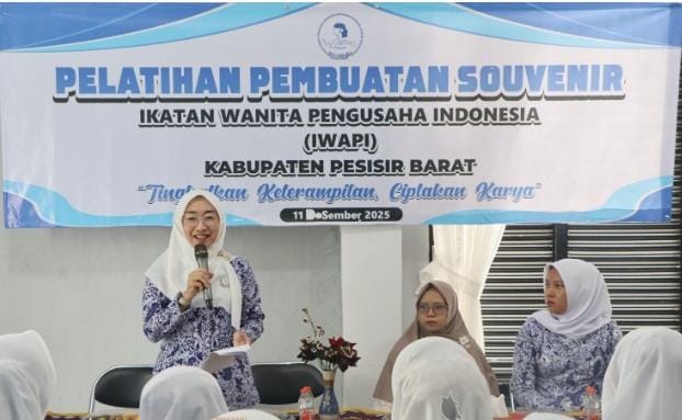 RADAR24.co.id — Ketua Dewan Pimpinan Cabang (DPC) Ikatan Wanita Pengusaha Indonesia (IWAPI) Kabupaten Pesisir Barat (Pesibar), Elizawati, membuka kegiatan Pelatihan Pembuatan Souvenir, di Gedung Dekranasda Kecamatan Way Krui, Kamis (11/12/2025).
