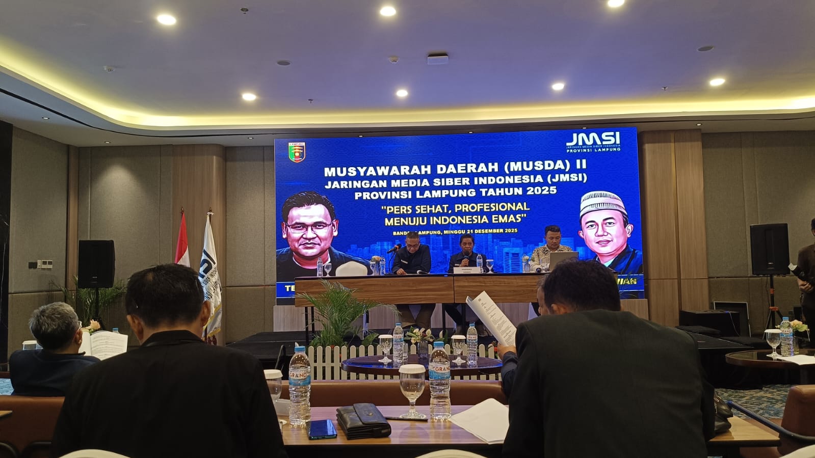 RADAR24.co.id — Musyawarah Daerah (Musda) Ke-II Jaringan Media Siber Indonesia (JMSI) Lampung bertema “Persamaan Sehat, Profesional, Menuju Indonesia Emas”, resmi dibuka hari ini, Minggu (21/12/2025), di Hotel Azana yang beralamat di Jl. Jenderal Sudirman No. 67, Rawa Laut, Enggal, Kota Bandar Lampung, Lampung.