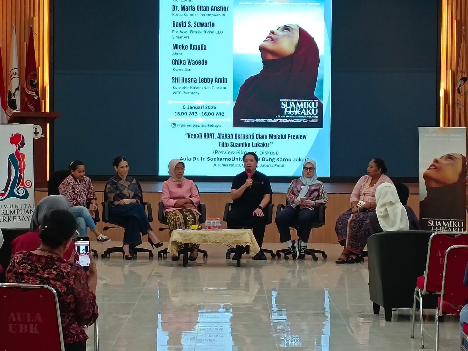 Diskusi bertema “Kenali KDRT, Ajakan Berhenti Diam Melalui Preview Film Suamiku, Lukaku “digelar di Aula Dr. Ir. Soekarno di UBK Jakarta dengan pembicara Ketua Komnas Perempuan Dr. Maria Ulfah Anshor, M.Si., Produser Eksekutif dan CEO SinemArt David S. Suwarto, Advokat dan Direktur WCC Puantara Siti Husna Lebby Amin, S.H., M.H., Aktor Mieke Amalia dan Komedian Chika Waode.