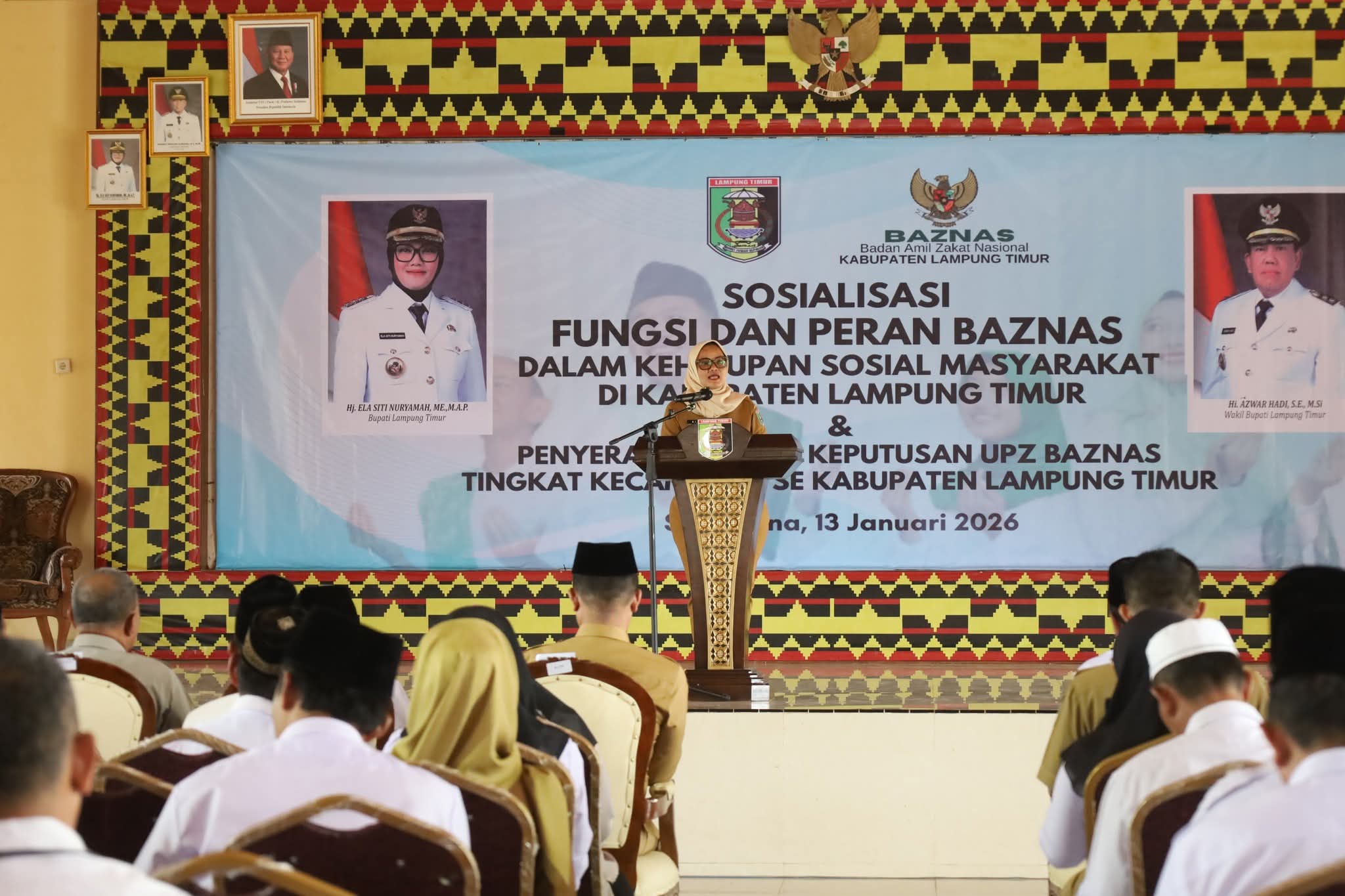 RADAR24.co.id – Bupati Lampung Timur, Ela Siti Nuryamah, menegaskan pentingnya peran Unit Pengumpul Zakat (UPZ) tingkat kecamatan sebagai ujung tombak pengelolaan zakat yang profesional, transparan, dan tepat sasaran. Hal tersebut disampaikannya saat memberikan sambutan dalam Penyerahan Surat Keputusan Badan Amil Zakat Nasional (BAZNAS) Kabupaten Lampung Timur tentang UPZ Tingkat Kecamatan se-Kabupaten Lampung Timur, yang berlangsung di Aula Rumah Dinas Bupati Lampung Timur, Selasa (13/01/2026).
