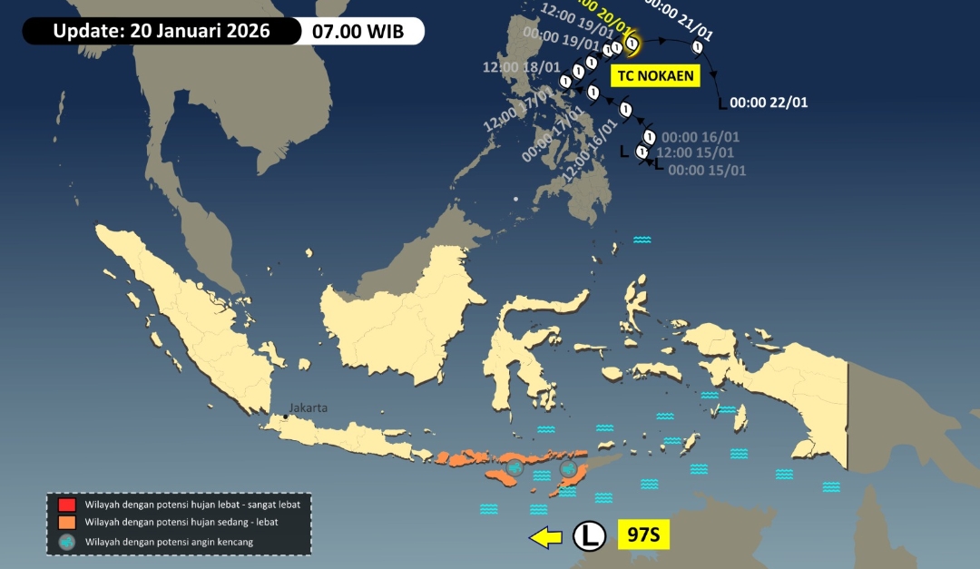 Hasil analisis dinamika atmosfer menunjukkan bahwa potensi hujan lebat yang menyertai kilat dan angin kencang akan melanda sebagian besar wilayah Indonesia secara bergantian menjelang akhir Januari 2026. Pada 21 Januari, cuaca ekstrem berpotensi terjadi di wilayah Bengkulu, Lampung, Banten, DKI Jakarta, Jawa Barat, Jawa Tengah, DIY, Jawa Timur, Bali, NTB, hingga NTT.