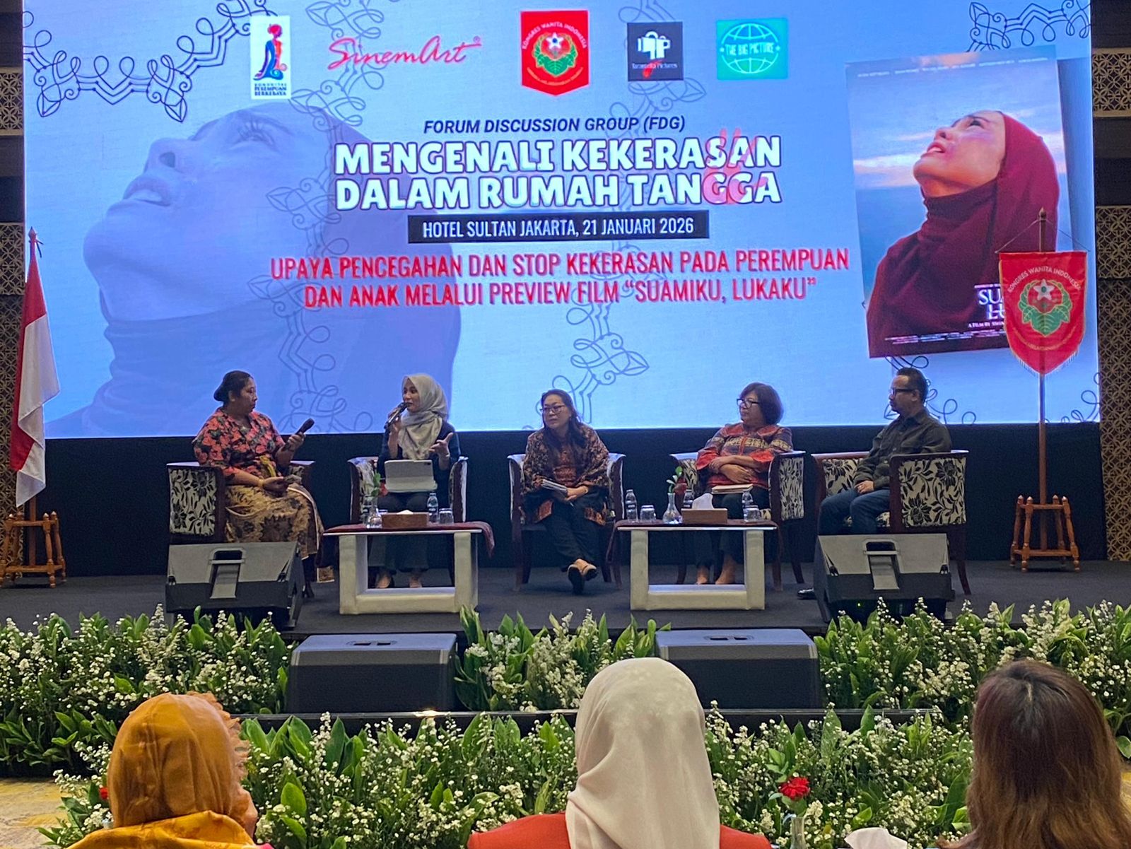 RADAR24.co.id — Kongres Wanita Indonesia (Kowani) berkolaborasi dengan SinemArt, The Big Pictures, Tarantella Pictures dan Komunitas Perempuan Berkebaya menyelenggarakan preview film Suamiku, Lukaku dan diskusi bertema “Mengenal Kekerasan Dalam Rumah Tangga – Upaya Pencegahan dan Stop Kekerasan Pada Perempuan Dan Anak Melalui Preview Film Suamiku, Lukaku” di Hotel Sultan, Jakarta pada Rabu, 21 Januari 2026.