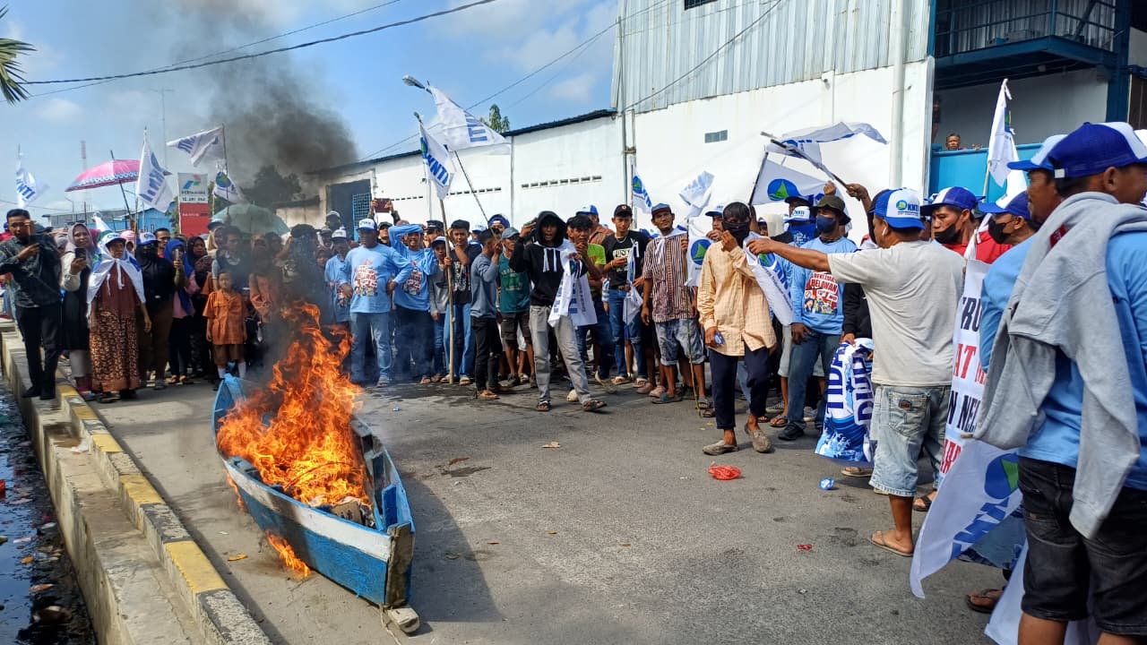 RADAR24.co.id — Aksi demo di tandai pembakaran sampan, Kesatuan Nelayan Tradisional Indonesia KNTI Sumatera Utara menolak pelebaran Reklamasi berjalan damai di depan Kantor Pelabuhan Perikanan Samudera Belawan Gabion Sumatera Utara, Jumat (13/2/2026).