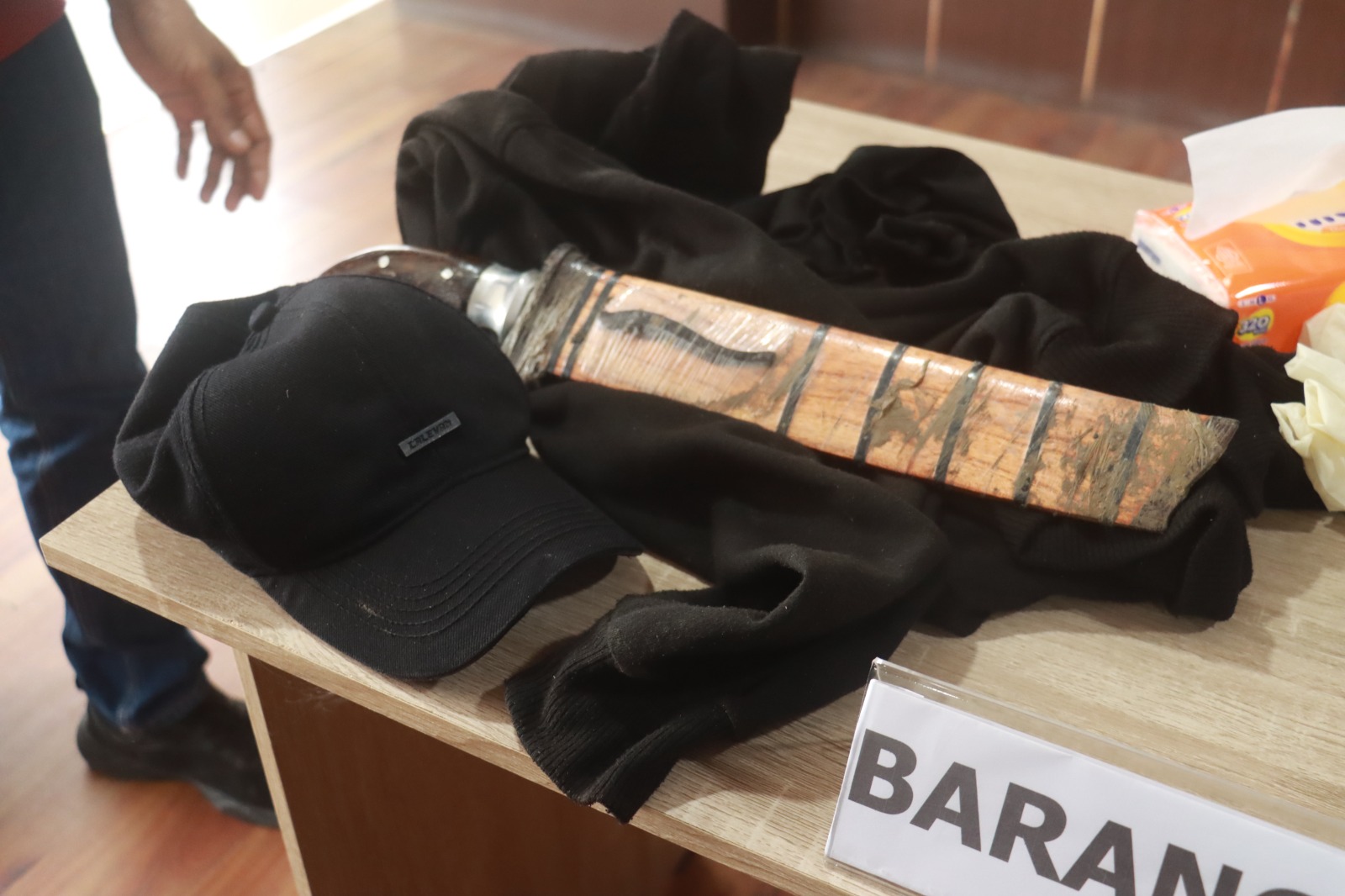 Dari tangan pelaku, polisi menyita sejumlah barang bukti, di antaranya satu bilah golok bersarung cokelat yang terdapat bercak darah, kain penutup wajah hitam, tas pinggang, topi, telepon genggam, serta jaket hoodie.