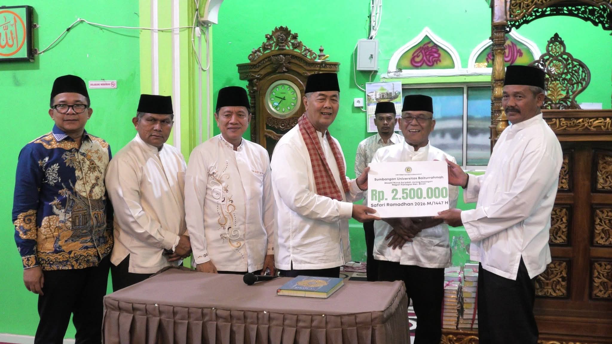 Dalam kesempatan tersebut, Pemerintah Provinsi Sumbar melalui TSR menyerahkan bantuan sebesar Rp50 juta untuk pembangunan masjid, serta mushaf Al-Qur’an. Selain itu, Universitas Baiturrahmah turut memberikan bantuan sebesar Rp2,5 juta.