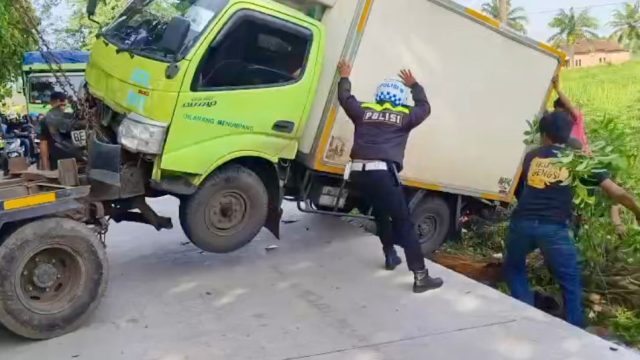 Truk Terperosok di way Penguburan Lampung Tengah, Pospam Bantu Evakuasi